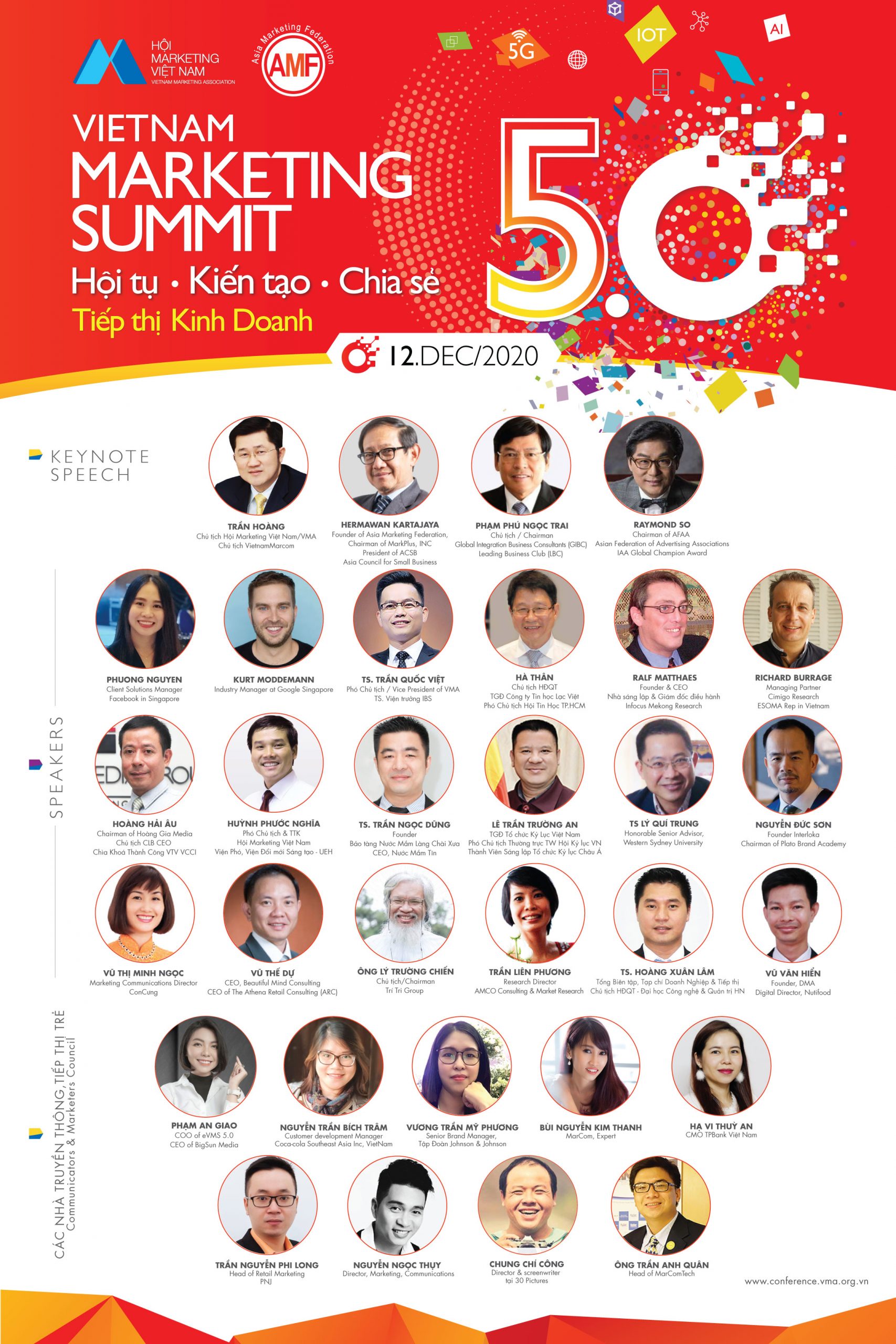 Vietnam Marketing Summit 5.0 là diễn đàn của những nhà marketing chuyên nghiệp, doanh nhân và nhà nghiên cứu trao đổi chia sẻ những giá trị hữu ích nhất trong tiếp thị kinh doanh. Thông qua VMS5.0, chúng ta sẽ có một diễn đàn được chia sẻ những công trình nghiên cứu, bài đọc và tình huống hay nhất được gợi ý từ các chuyên gia, ngoài ra, VMS5.0 năm nay bàn tất cả những giải pháp marketing trong bối cảnh hậu Covid-19 dưới môi trường kinh doanh Việt nam, hơn 20 diễn giả, chuyên gia sẽ đóng góp nhiều góc nhìn khác nhau nhằm tạo thêm năng lượng sáng tạo cho cộng đồng doanh nhân, nhà tiếp thị, chuyên gia marketing trong giai đoạn khó khăn, thách thức nhất của nền kinh thương thế giới. Một số diễn giả quốc tế sẽ góp mặt như: Nhà sáng lập Liên đoàn Marketing Châu Á (AMF) – Chủ tịch Liên đoàn các Hiệp hội Truyền thông Quảng cáo Châu Á (AFAA).Google, Facebook Singapore, Cimigo, Mekong Research, GIBC…