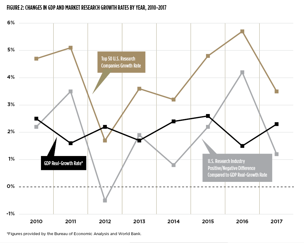 We can also look to the U.S. gross domestic product as another benchmark. In Figure 2, the annual U.S. GDP shows the yearly growth of the estimated value of all the country’s produced goods and provided services. As previously reported, the U.S. research industry’s annual growth rate has historically tracked ahead of the annual GDP real-growth rate, except during the recession of 2009 and in 2012. The U.S. research industry’s growth rate exceeded the GDP growth rate by 2% in 2015 and in 2016 doubled that figure to 4%. In 2017 the U.S. research industry is tracking slightly ahead of GDP at 1.2%.
