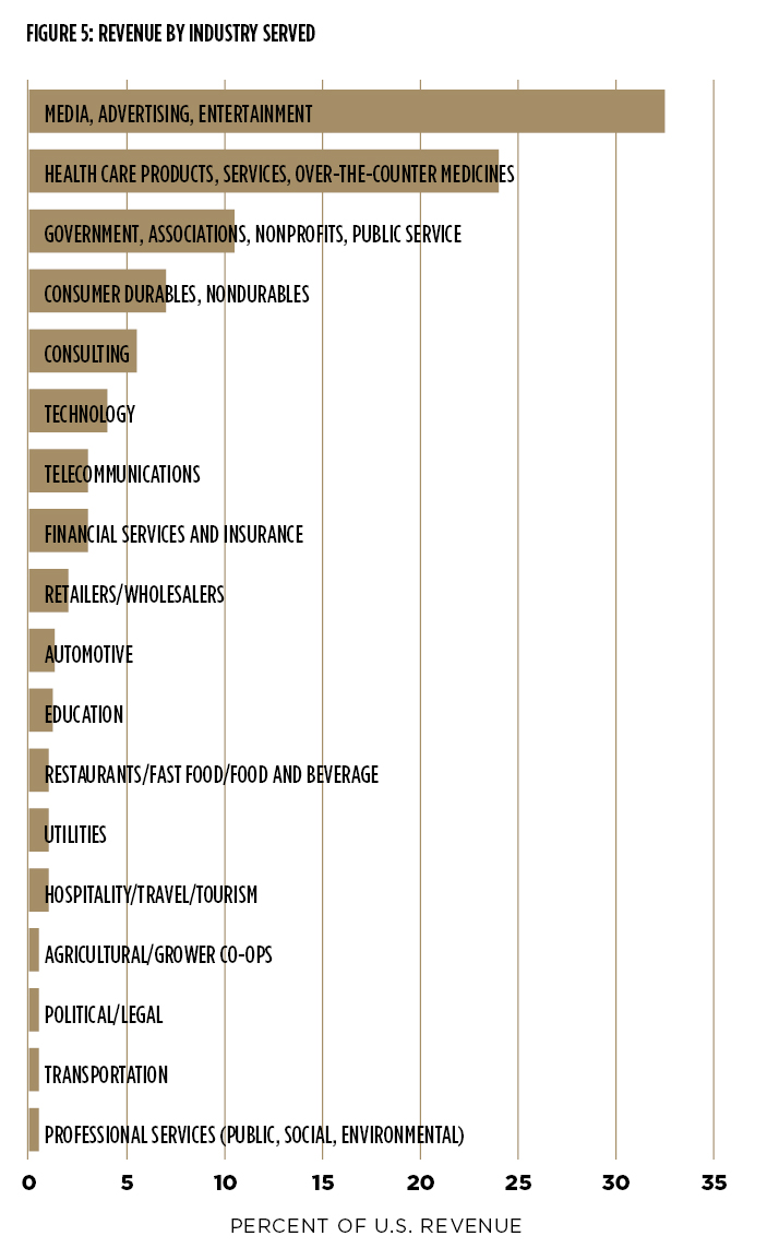 The top 10 companies’ total 2017 revenue of $20.37 billion represents nearly 80% of the total 2017 revenue for all 198 companies included in this year’s report. Nielsen accounts for 25% of the total 2017 revenue for all of the 198 companies. The top 10 companies represent 73.5% ($9.07 billion) of the total U.S. revenue and 85.6% ($11.30 billion) of the total non-U.S. revenue for all of the 198 companies in this year’s report.