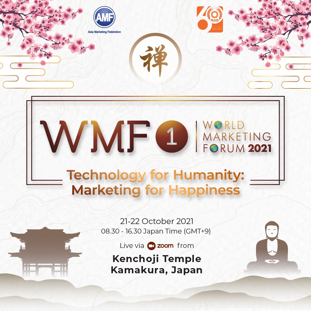 The Asia Marketing Federation (AMF), in collaboration with the Asia Productivity Organization (APO), will hold the 2021 World Marketing Forum (WMF) with the theme Technology for Humanity and Productivity For Happiness. It discusses how the development of technologies such as artificial intelligence will profoundly impact human lives. The inaugural event, which will be held on October 21st-22nd, 2021, at Kenchoji Temple, Kamakura, Japan, is the first world marketing forum spearheaded by the Indonesia Marketing Association (IMA) and the Japan Marketing Association (JMA). Due to travel and gathering restrictions during the pandemic, the event will combine the live in-person setting with virtual components so that participants can feel the experience of being in the venue directly where the forum is being held.