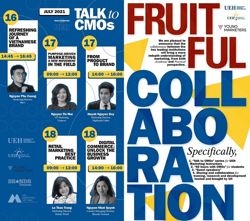 Ngày 16/7/2021, Đại học Kinh tế TP.HCM (UEH) và Young Marketers ký kết thoả thuận hợp tác chiến lược nhằm phát huy thế mạnh của đôi bên, và cùng triển khai các dự án mang lại giá trị cho cộng đồng Marketing. Hai bên sẽ khởi động bằng chương trình “Talk to CMOs – Đối thoại cùng các CMO”, từ ngày 16-18/7, trên nền tảng online nhằm thích ứng với diễn biến của dịch COVID-19.